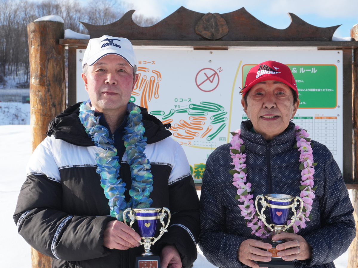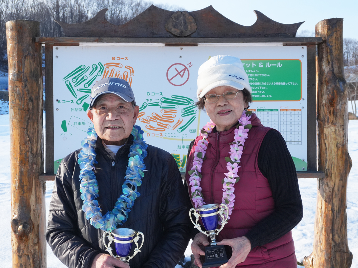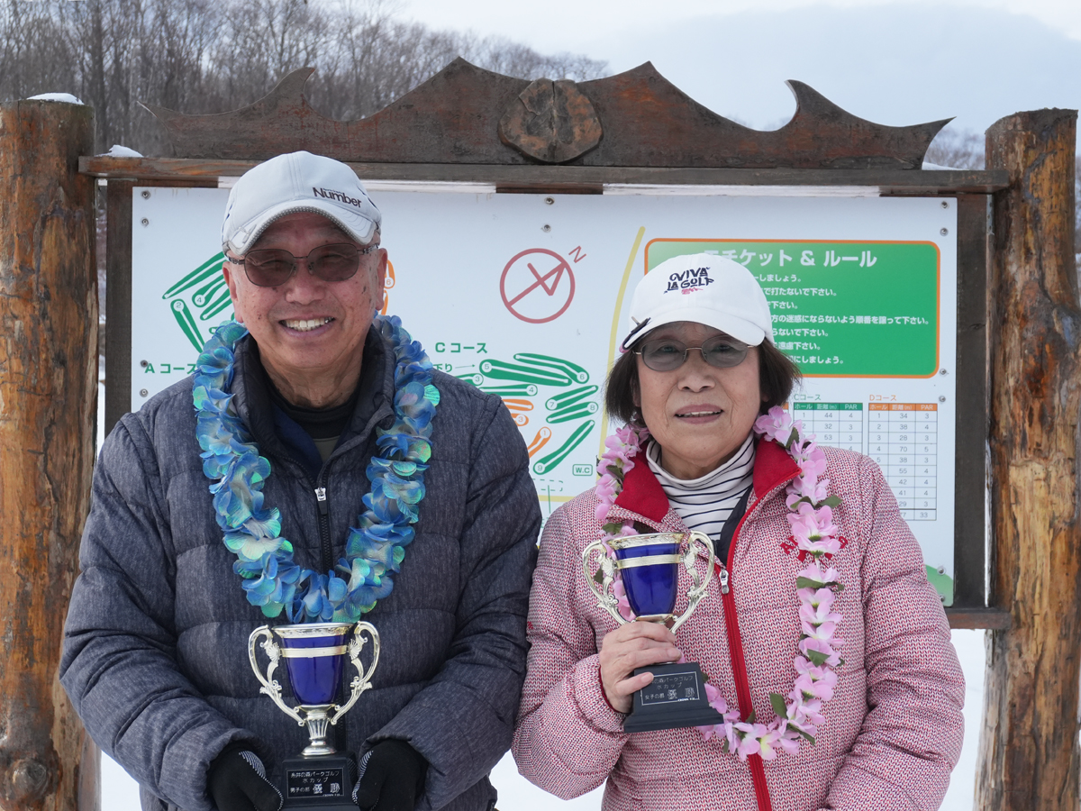 参加者44名 1月23日(金)12時30分スタート[ 優勝者 ]男子/長勢邦男さん ネット84女子/宍戸栄さん ネット84今日は屋内オンリーの「糸井の森金杯」です。明日の前哨戦としての方はもちろん、冬眠から覚めた初打ちの方から金杯と聞いて勝手に体が動くファンまでのんびりと楽しく遊んでいただきました。さて、男子はハンデが少なくても関係なし。ベスグロでぶっちぎった長勢邦男さんが優勝。女子は本日の最大ぶっちぎりハンデで接戦を制した宍戸栄さんがヒヤヒヤ優勝。おめでとうございます!ベスグロは男子92、女子98でした。ところで本日の優勝記念写真には「日本ハム・2軍誘致」のノボリがかなり強引に写り込んでいます。糸井の森では、長年「日ハム杯」を開催し、ファイターズを応援してきました。その流れで、苫小牧市の2軍誘致活動も全力で応援中です。もちろん署名活動も実施しています。糸井の森は、スポーツが地域にもたらす力を信じています。みんなで応援して、実現しましょう!