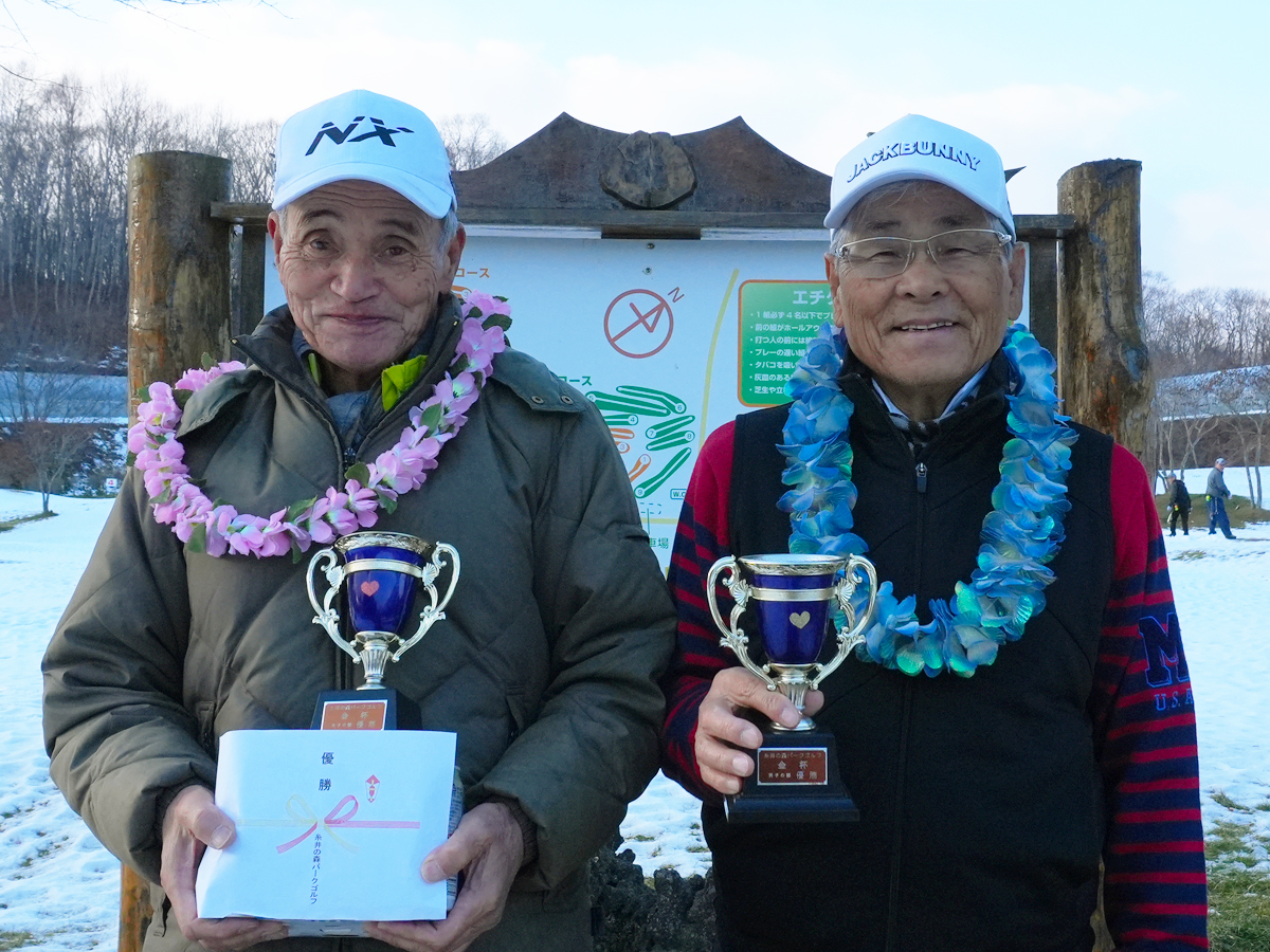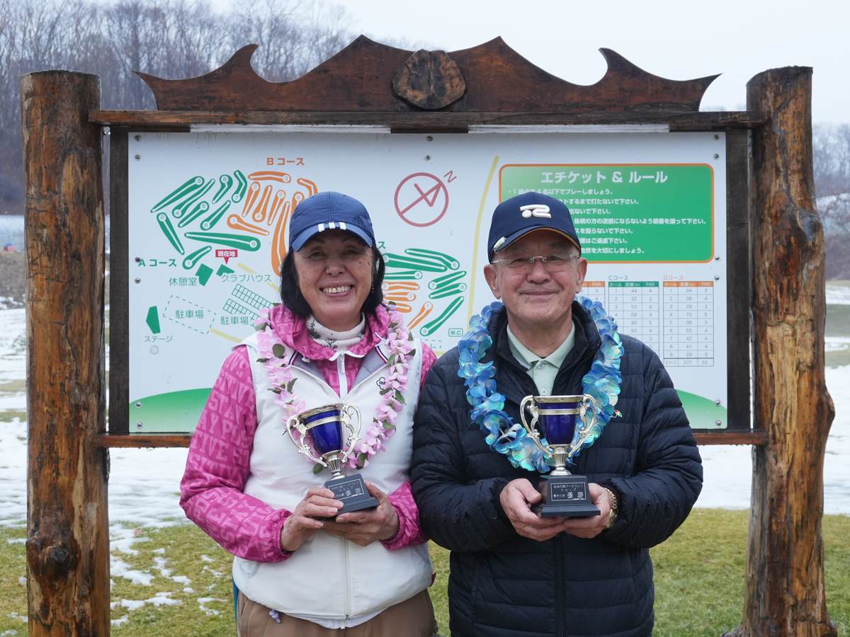 参加者40名 12月22日(月)12時30分スタート[ 優勝者 ]田中正さん・長勢邦男さん ネット90今日は月曜のお楽しみ「月曜ペアでしょう」。先週の大雪から1週間。暖かい日が続いたものの雪解けは意外とスローペース。あと2〜3センチでしょうか。それでも待ちきれず、屋外に挑んだ強者女性が1人!恐れ入りました。さて、明日のペア戦を控え、今日は絶好のペア前哨戦。結果は田中正さん、長勢邦子さんペアがプラスハンデをはねのけ優勝。おめでとうございます!