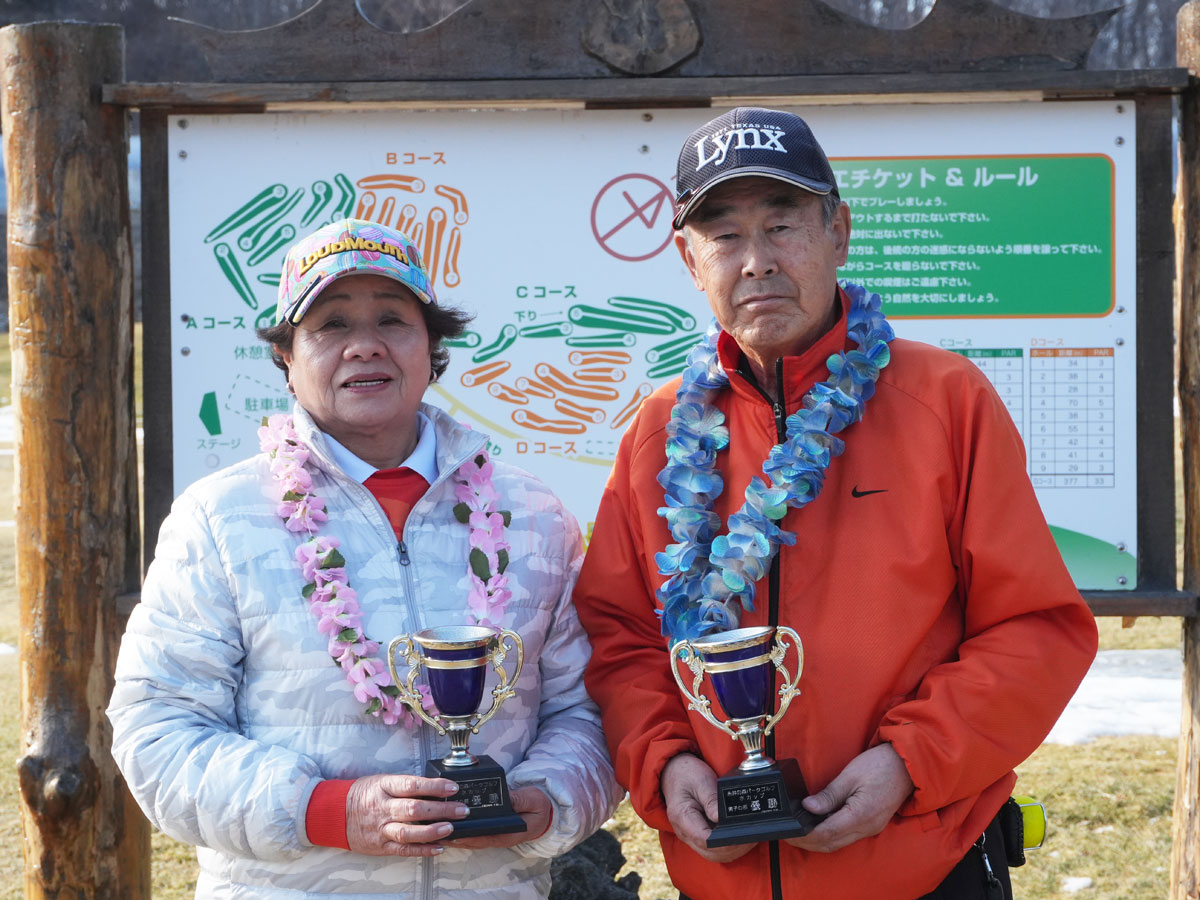 参加者56名 2月23日(月)12時30分スタート[ 優勝者 ]中村伸さん・中村麗子さん ネット83今日は月曜のお楽しみ「月曜ペアでしょう」。気軽に参加できる、ペア戦の登竜門としておかげさまで公式大会を上回るほどの人気となってきました。男女ペアはもちろん、男子ペア、女子ペア、そしていろいろと事情ありそうなペアまで仲良く、時には火花を散らしながら楽しんでいただきました。ハンデは85歳以上が−2点。さらに女子ならボーナス−2点が加わって−4!ペアの相手としてラブコールが止まらない状態です。女性で85歳以上の方、ぜひ人生最大のモテ期を味わいにご参加ください。さて、融雪カウントダウン。全国の屋外派の皆さんは1日1日数字が減っていくのを楽しみにしていたと思いますが、まさかの展開。たった1日で積雪10pがゼロ(アメダス)!昨日はいつも雪解けが遅いところに融雪剤を散布しました。コースにはまだ少し雪が残っていますが、この先も暖かい日が続きそうなので融雪マシンをピッカピカに磨いて本日車庫入れ完了。苫小牧の短い冬は終わりました。(と、信じたい)そして結果です。中村伸さん・中村麗子さんご夫妻がAコースは2回とも17という信じられない点数を叩き出して優勝。おそらく今、Aコースのみのペア大会を行ったら世界一だと思います。おめでとうございます!