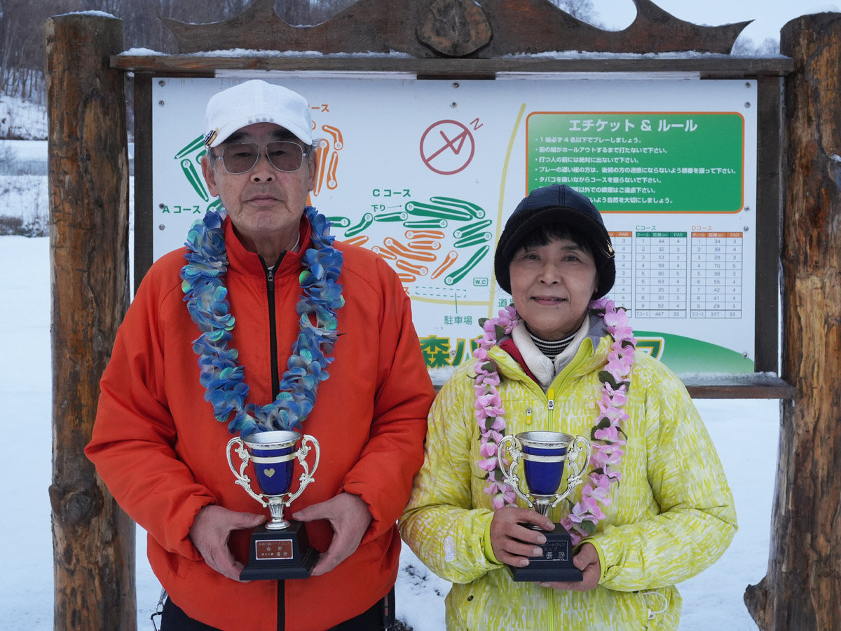 参加者48名 1月19日(月)12時30分スタート[ 優勝者 ]高柳哲雄さん・真鍋幸子さん ネット82今日は月曜のお楽しみ「月曜ペアでしょう」。今週もたくさんのご参加、ありがとうございました。屋外派の皆さんへ業務連絡です。気象庁発表では積雪1cmとのことですが、まだコースは真っ白の状態です。糸井駅近く、パチンコ屋さん隣に観測点があるようですが、もしかするとそこはパチンコ屋さんの熱気で雪解けが早いのかもしれません。もっとも、糸井の森の熱気も負けていないはずなんですが。で、待てない方にはスコップはもちろん、除雪機、マキタの新兵器までフル装備でお貸しします。お気軽にご利用ください。さて結果は、5位までが1打刻みで並ぶ大混戦の中、高柳哲雄さん・真鍋幸子さんペアが見事優勝。おめでとうございます!