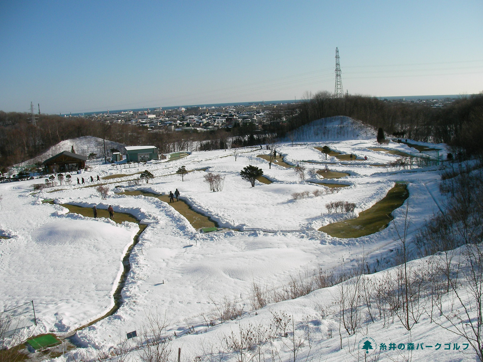 除雪した屋外「芝」コースの冬季営業写真。 |