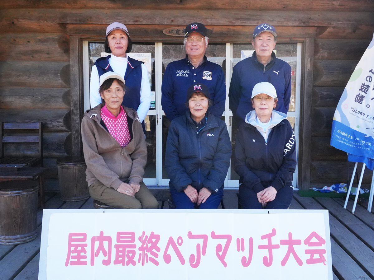 結果は、高安昭仁さん・門脇豊子さんペアが135打の圧勝で屋内ペア2年ぶり5度目の優勝。準優勝はネット138で中澤志津子さん・山本えり子さんの女子ペア、第3位は141で豊田耕二さん・近江谷昌子さんが入りました。