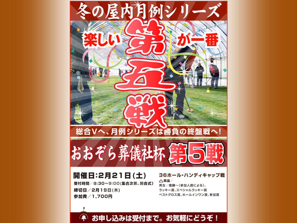 2月21日、『おおぞら葬儀社杯・第5戦』が男女42名の参加で開催されました。いよいよ残すところ2戦。終盤戦に入っても女子の活躍が目立ち、今大会も平均スコアは男子を上回りました。