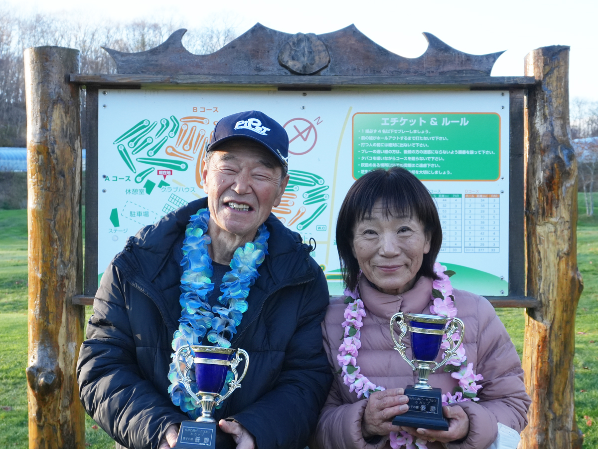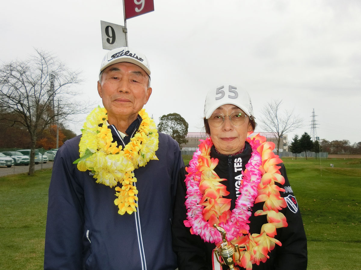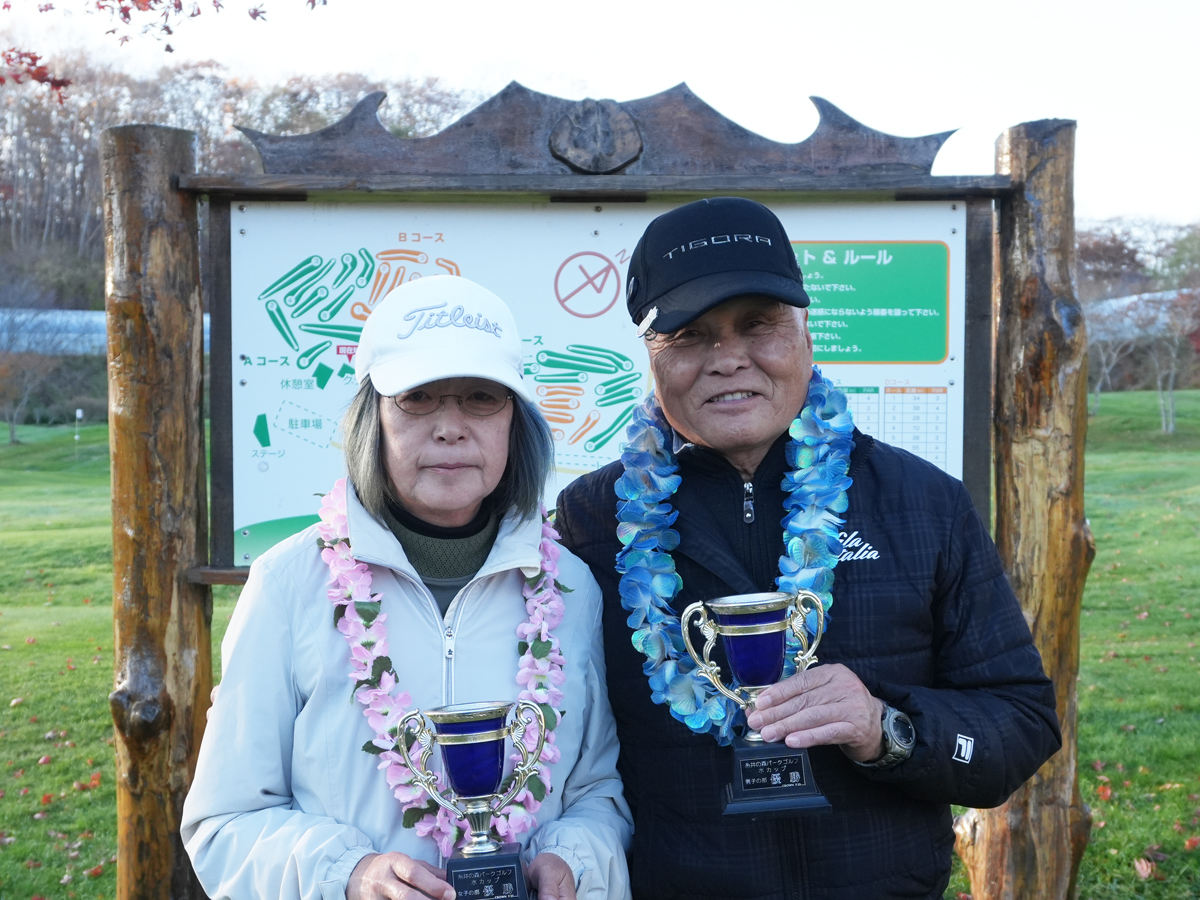 参加者22名 10月31日(金)12時30分スタート[ 優勝者 ]男子/中村伸さん ネット84女子/近江谷昌子さん ネット87今日は姉妹コース「はまなすクラブ」のお遊び金杯です。明日は糸井の森の月例ということで少し影響があったようです。で、その糸井の森月例ですが、明日は大荒れの予報のため、残念ながら中止とさせていただきました。ほのか様の協賛については11月4日のグラチャンに移行し、今年は「苫小牧温泉ほのか杯グランドチャンピオン大会」として開催します。月例を本日15時までキャンセル無くお申し込みされていた方で、まだ★を獲得されていない方は救済させていただきます。ぜひグラチャンに、「印籠」を目指して挑戦してください。さて、金杯です。男子はシングルハンデでベスグロの中村伸さんが、女子はこちらもシングル&もうちょいでベスグロの近江谷昌子さんが優勝。おめでとうございます!