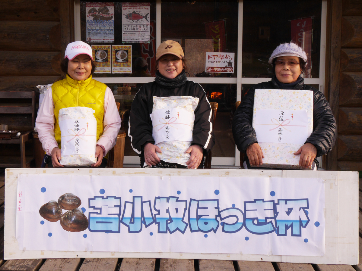 11月27日、「第5回苫小牧ほっき杯」が全道各地から男女192名(内、苫小牧97名)の参加で開催されました。苫小牧が全国に誇るほっき貝を冠した大会も今年で5回目。しかし、5回目にして初めての降雪。朝、真っ白になっていたコースでしたが、参加プレーヤーのご協力により9時にはABCDコースの除雪が完了。9時半すぎに鐘の音を合図にプレーが開始されました。今年も入賞、ラッキー賞などの景品をたくさんご用意し、ほっき貝はお一人最低5枚、スペシャルラッキー賞には10枚持ち帰っていただきました。また本間ゴルフ様の2017年モデル先行試打会も好評。恒例のほっきカレーは40杯以上のご注文を頂きました。