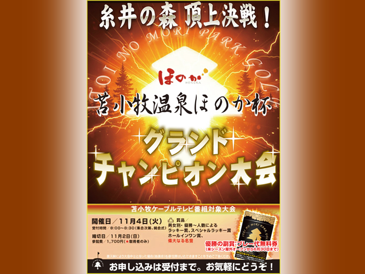 11月4日、糸井の森の今季No'1の座を懸けた一発勝負、「苫小牧温泉ほのか杯グランドチャンピオン大会」が選ばれし102名の参加で開催されました。毎月の月例大会から優秀な成績を収めた実力者が集結。“グラチャン”の証「印籠」を目指して大会に挑んでいただきました。なお、11月度月例が悪天候のよって中止になったため、苫小牧温泉ほのか様の協賛(無料入浴券30本)は今大会に、そして41名の方が達成された皆勤賞と月例総合3位までの表彰も合わせて行いました。